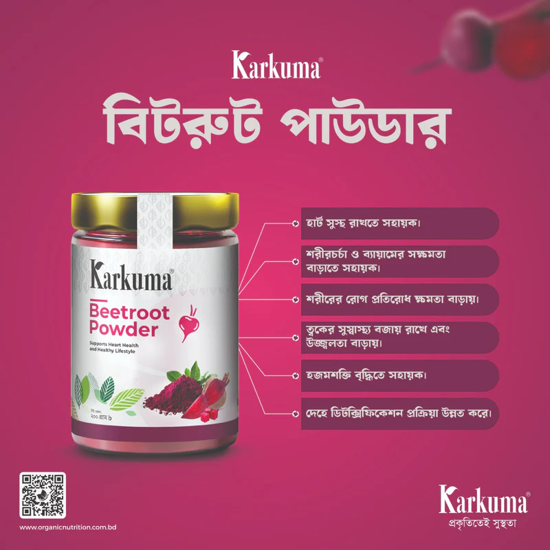 Karkuma Beet Root Powder is 100% natural and free from any artificial colors, flavors, sweeteners, preservatives, and harmful pesticides. Sourced from a world-renowned and trusted supplier, it is carefully dried and crushed using a cool process. Unlike conventional drying methods that rely on excessive heat and result in nutrient loss, this gentle technique helps retain more of the beetroot’s natural color, flavor, and nutrients—making it a healthier choice with better taste. It contains high fiber, antioxidants, essential vitamins, and minerals. The natural nitrates in beetroot convert into nitric oxide in the body, which helps improve blood circulation, supports blood pressure regulation, and strengthens the heart. It can be consumed daily by mixing 1–2 teaspoons, or as per taste, with water.